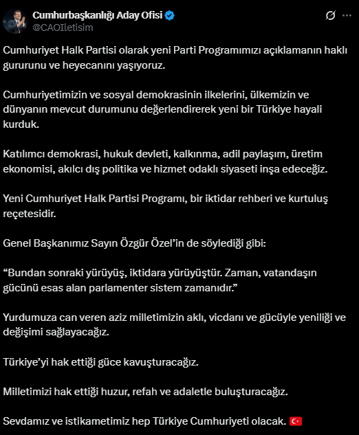 “Cumhuriyet Halk Partisi olarak yeni Parti Programımızı açıklamanın haklı gururunu ve heyecanını yaşıyoruz.