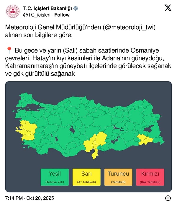 İçişleri Bakanlığı’nın paylaşımına göre bu gece Osmaniye, Hatay, Adana ve Kahramanmaraş’ta kuvvetli yağış olacak.