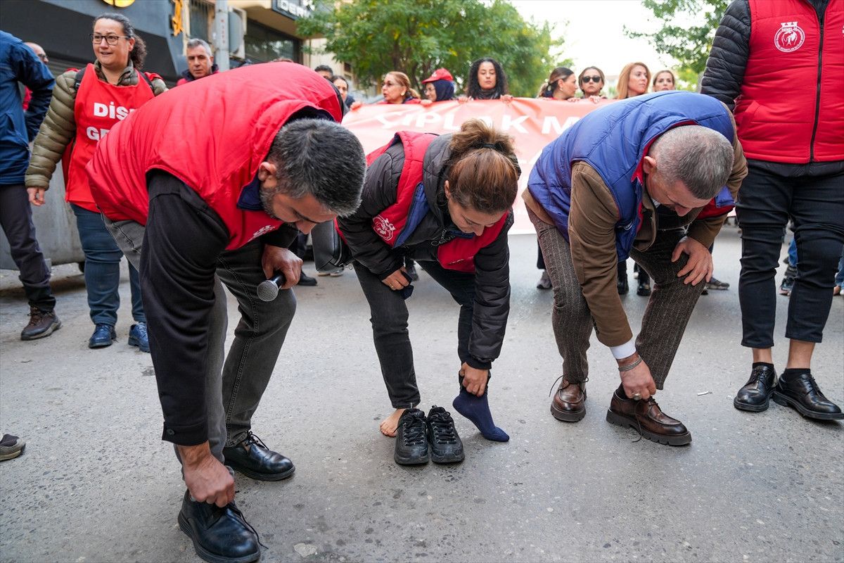 Yürüyüş sırasında slogan atan işçiler, ellerindeki ayakkabıları salladı.