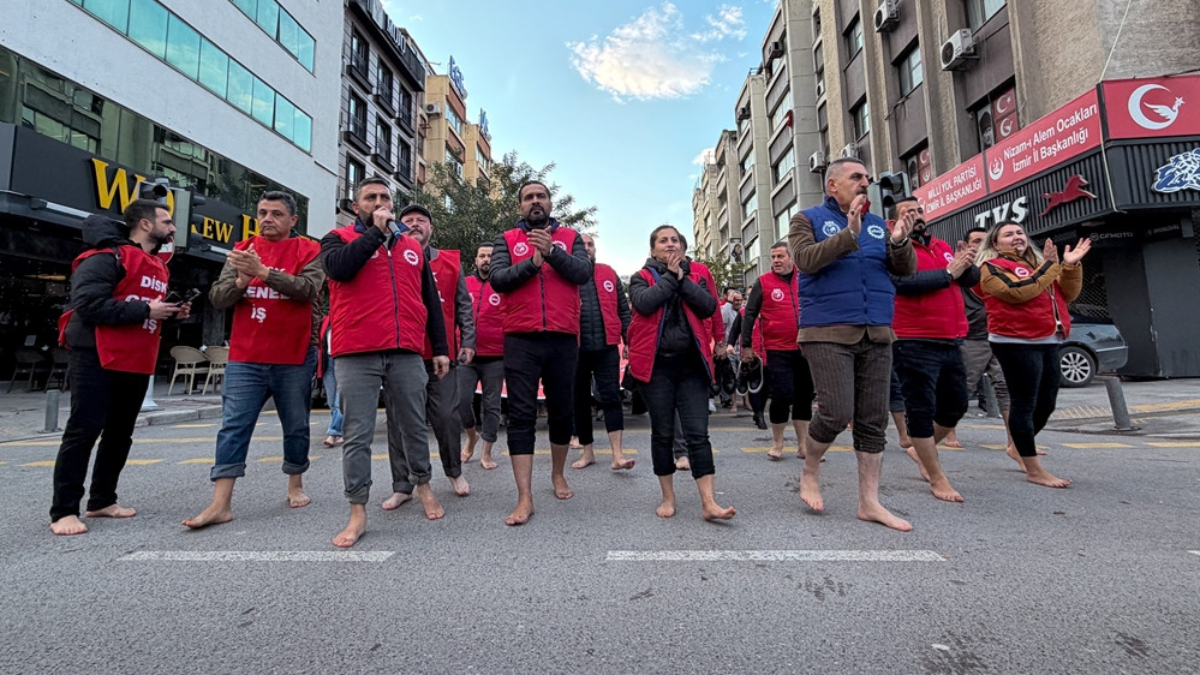 Genel İş İzmir Şubeleri binası önünde bir araya gelen işçiler, “Çıplak maaşa karşı çıplak ayak ile yürüyoruz” pankartı açtı, slogan attı.