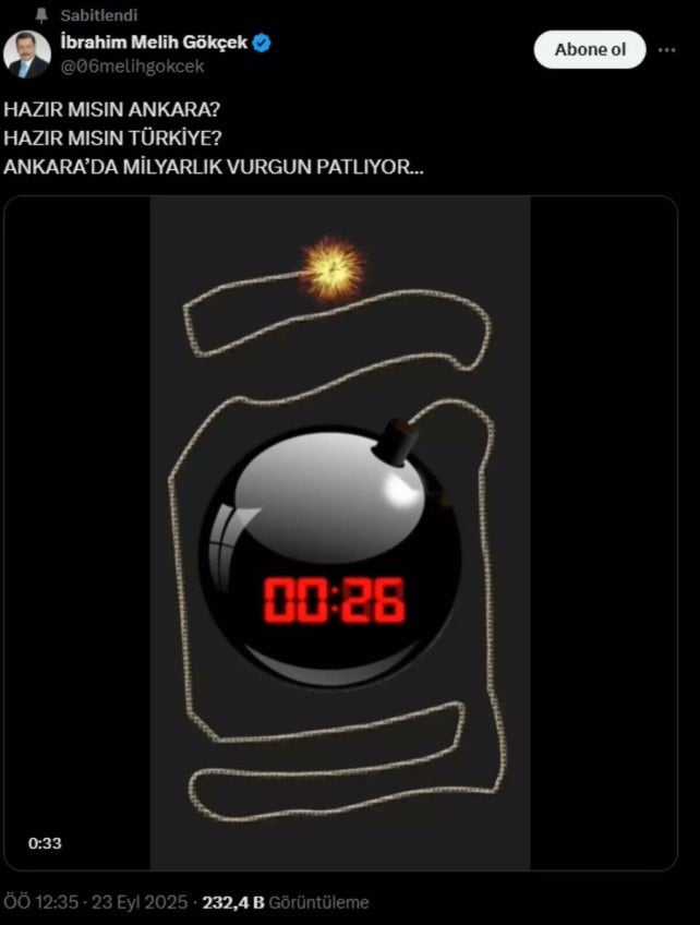 Bu gelişmeden kısa süre önce Melih Gökçek, sosyal medya hesabından bomba görselinin üzerine “Hazır mısın Ankara? Hazır mısın Türkiye? Ankara’da milyarlık vurgun patlıyor” notu düşerek dikkat çeken bir paylaşımda bulunmuştu.