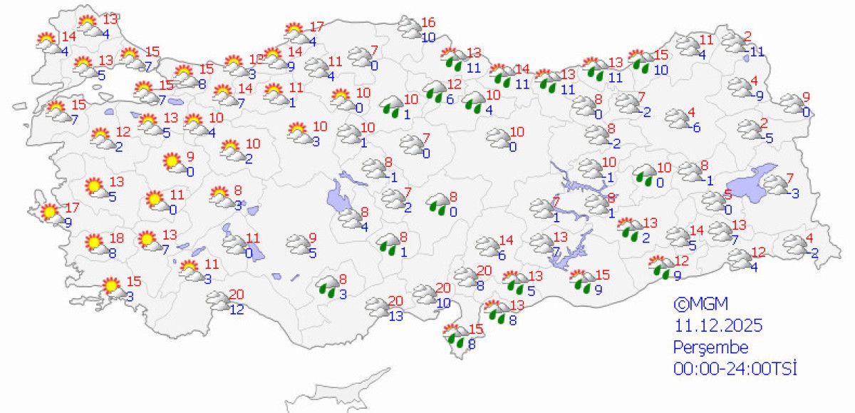 Ülke genelinde önümüzdeki günlerde mevsim normalleri civarındaki sıcaklıklar devam edecek. Özellikle Ege, Akdeniz ve İç Anadolu bölgelerinde yoğun yağışlar bekleniyor. Pazar günü kuzey ve iç kesimlerde bulutlu bir hava hakim olacak.